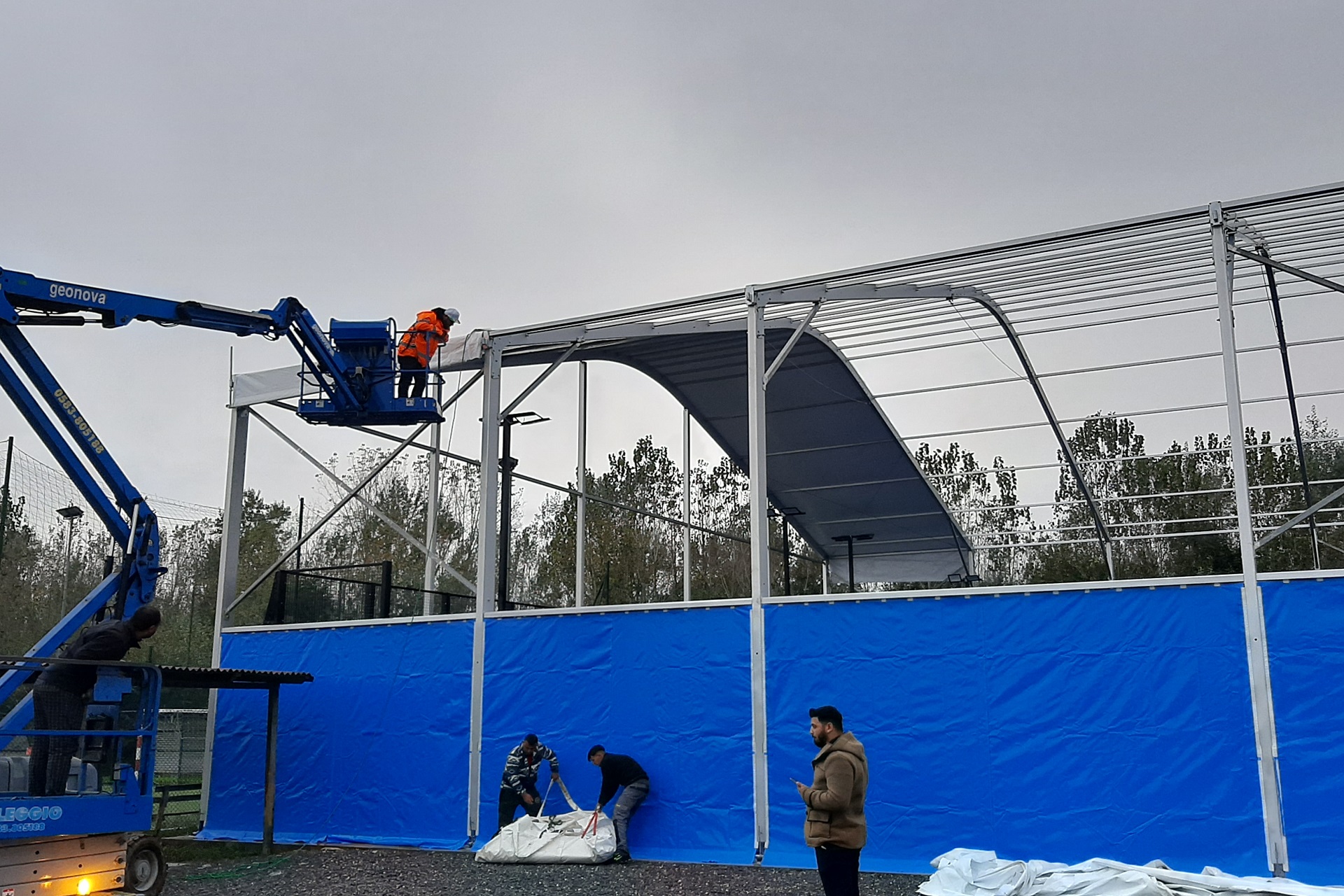 Nelle giornate successive è stata portata a termine la copertura inserendo travetti, bulloni, corde e travi di tensione fino a renderla completa in ogni suo elemento metallico per poter finalmente iniziare la procedura di inserimento dei teli in PVC per dare l'opera compiuta. Ovviamente, come in ogni cantiere, qualche piccolo contrattempo si è presentato ed ha portato il team a trovare rapidamente soluzioni tecniche che hanno consentito di consegnare il lavoro nei tempi stabiliti.